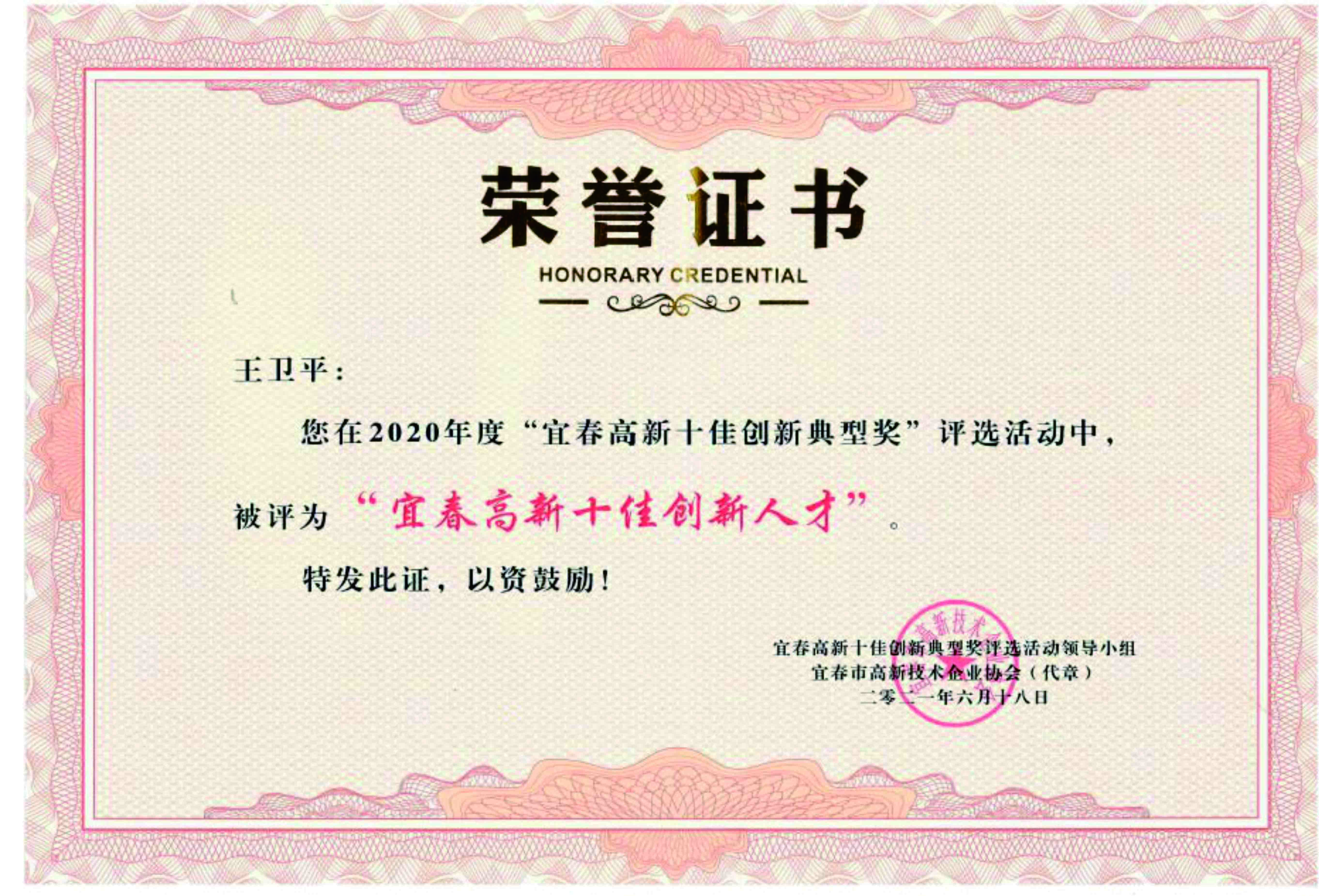 为表彰王卫平同志为我市高新技术企业做出的突出贡献,特批准为“宜春高新十佳创新人才”的殊荣。