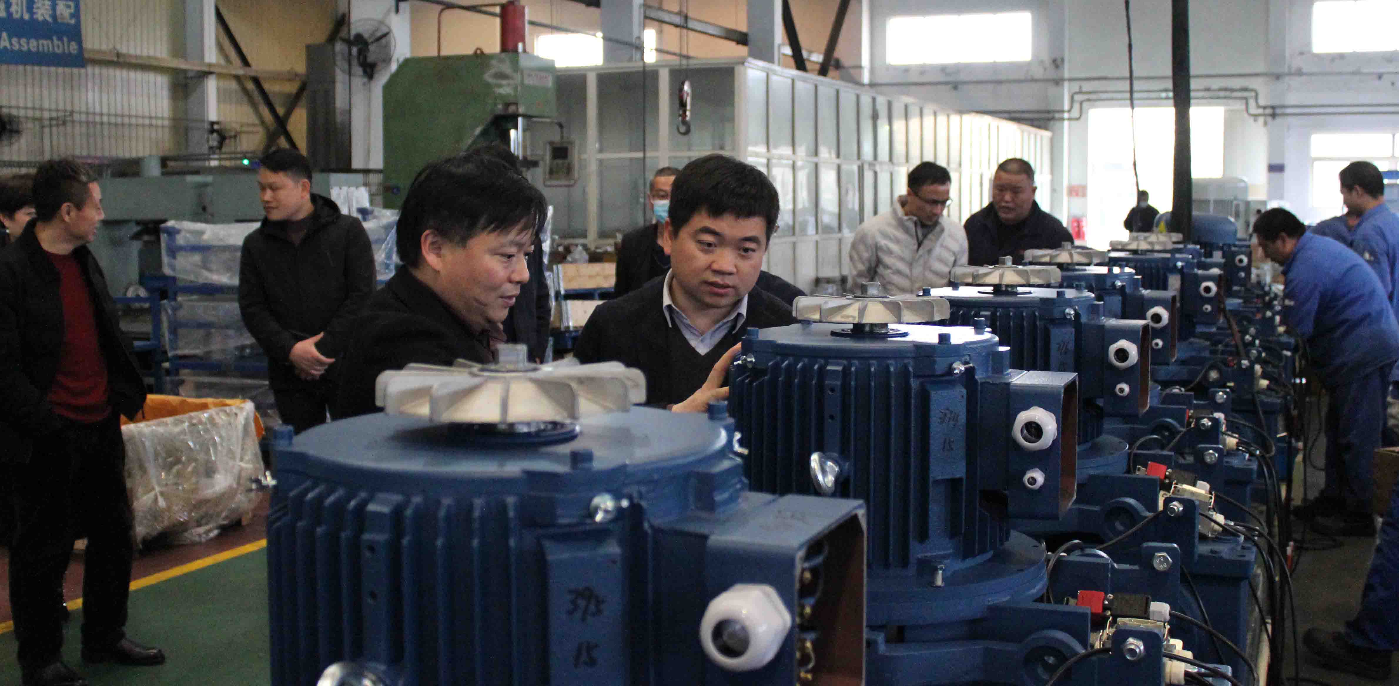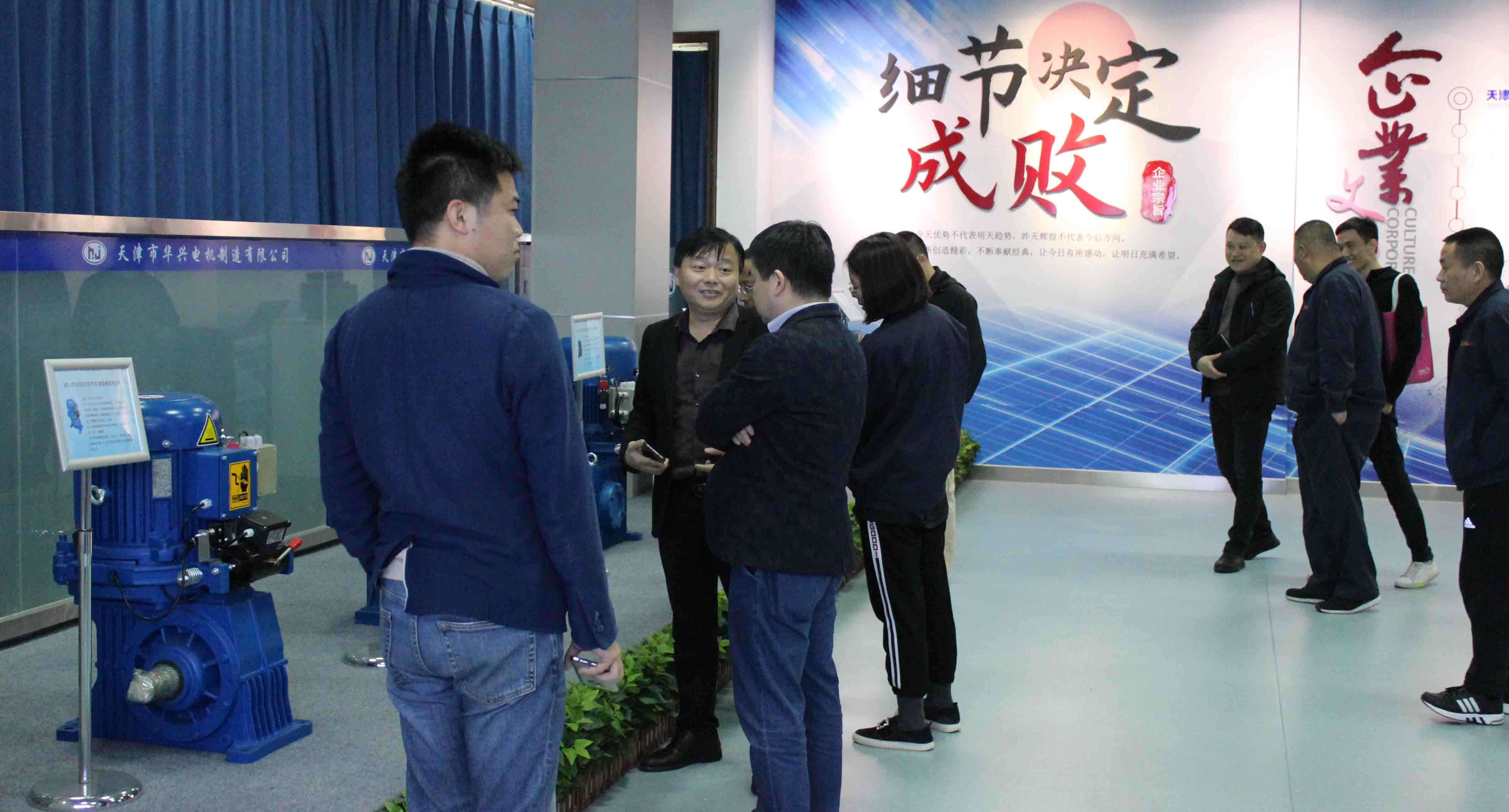 在黄显祥总经理的陪同下,李总一行首先来到华兴电机展厅,先后参观了代表华兴最新研发成果的各系列产品,黄总向项目组详细介绍了产品的技术特点、性能优势以及华兴近年来的市场业绩增长情况。随后,李总一行深入生产车间开展实地考察,重点调研了华兴电机的组装工序和嵌线工序。