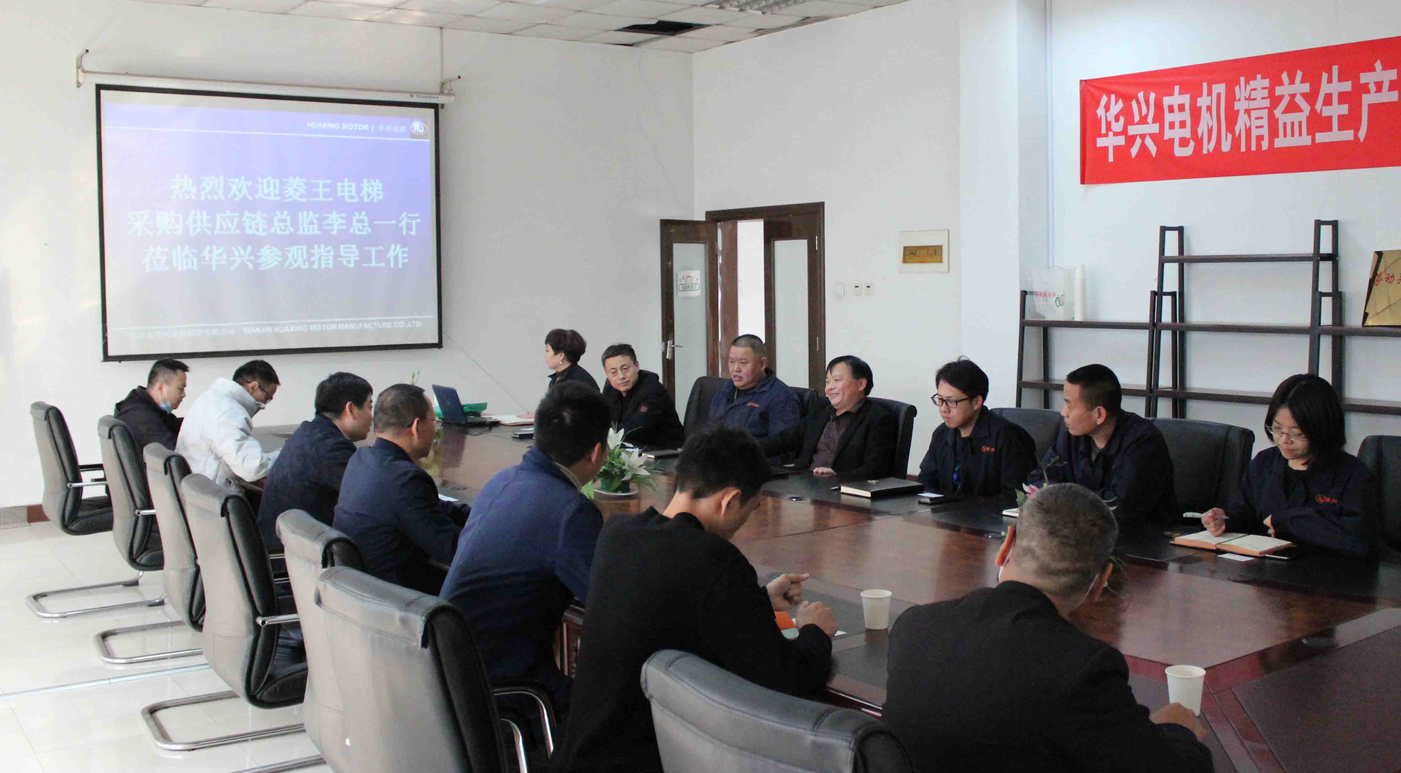 2021年3月10日下午,广东菱王电梯有限公司副总经理李总,品质中心总监余总,制造中心戴部长以及相关人员,莅临天津华兴电机进行实地考察调研,华兴电机总经理黄显祥、副总经理闫仕明以及生产技术团队陪同接待。